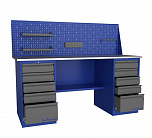 Двухтумбовый. Допустимая нагрузка на столешницу 1000 кг. Опорные элементы выполнены сварными из холоднокатаной стали. Для выполнения сборочных, ремонтных, слесарных, монтажных и других видов работ на производстве, в сервисных центрах, мастерских, гаражах, а также для обучения технологии в учебных заведениях. Комплектуется полкой-стенкой, расположенной под столешницей для удобного размещения габаритного инструмента и оснастки. Размеры верстака: 855x1796x696 мм. Вес: 113 кг. Поставляется в 4 комплектациях на выбор.