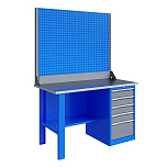 Однотумбовый. Допустимая нагрузка на столешницу 750 кг. Опорные элементы выполнены сварными из холоднокатаной стали. Верстак состоит из столешницы, опоры, тумбы P5 с четырьмя малыми и одним большим ящиком и полки-стенки. Все металлические элементы покрыты полиэфирной порошковой краской. Столешница состоит из фанеры марки ФСФ толщиной 24 мм, которая покрыта лаком-антисептиком и листом оцинкованной холоднокатаной стали толщиной 1,2 мм. Размеры (ВхШхГ) 855x1396x696 мм.