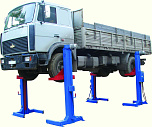 г/п. 10 тонн. Четырехстоечный. Электромеханический. Для ремонта грузовых автомобилей отечественного и импортного производства и автобусов на любой ровной площадке. Привод червячный редуктор, с концевыми выключателями нажимного действия, ограничивающими ход каретки. По отдельному заказу комплектуется установочными рамами. Поставляется в 2 вариантах Стандарт (в помещение) и ТЗ (Для эксплуатации на улице).