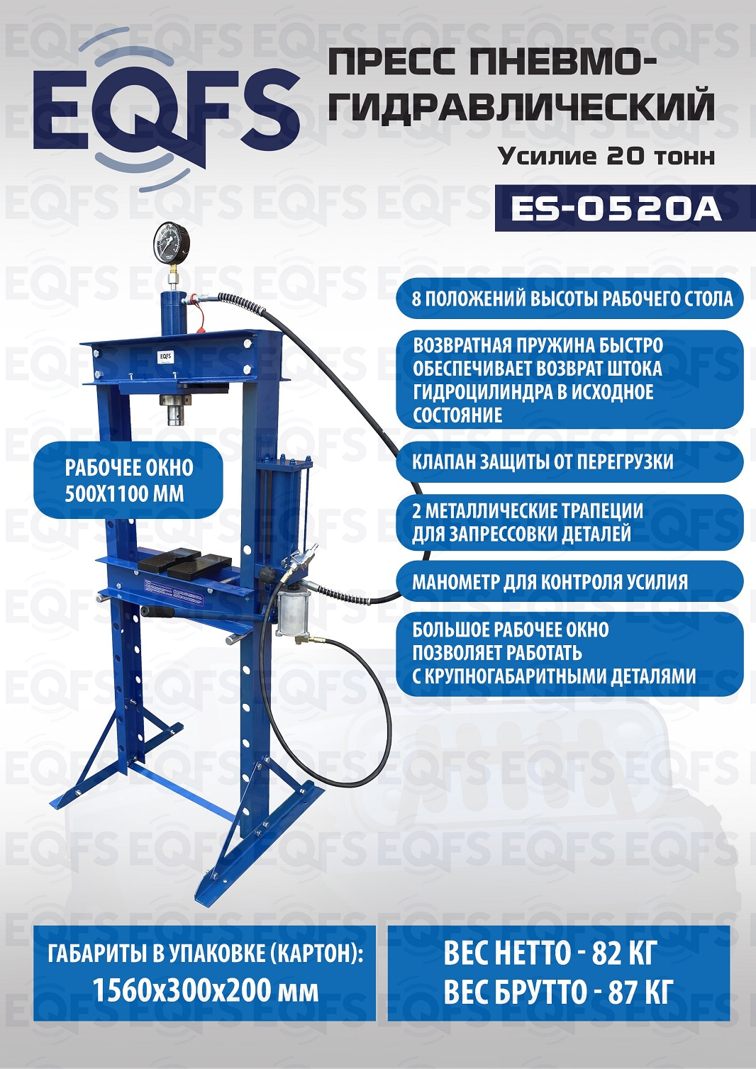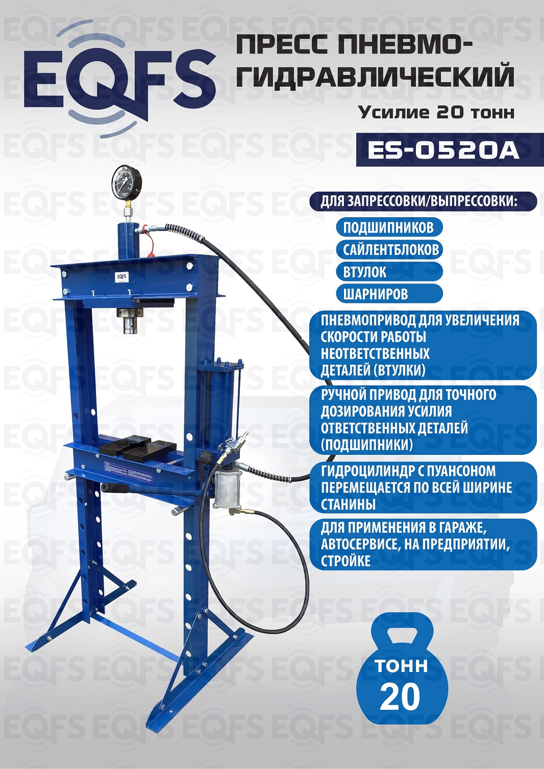 · Пресс укомплектован пневмогидравлическим и ручным насосом с максимальным усилием 20т.