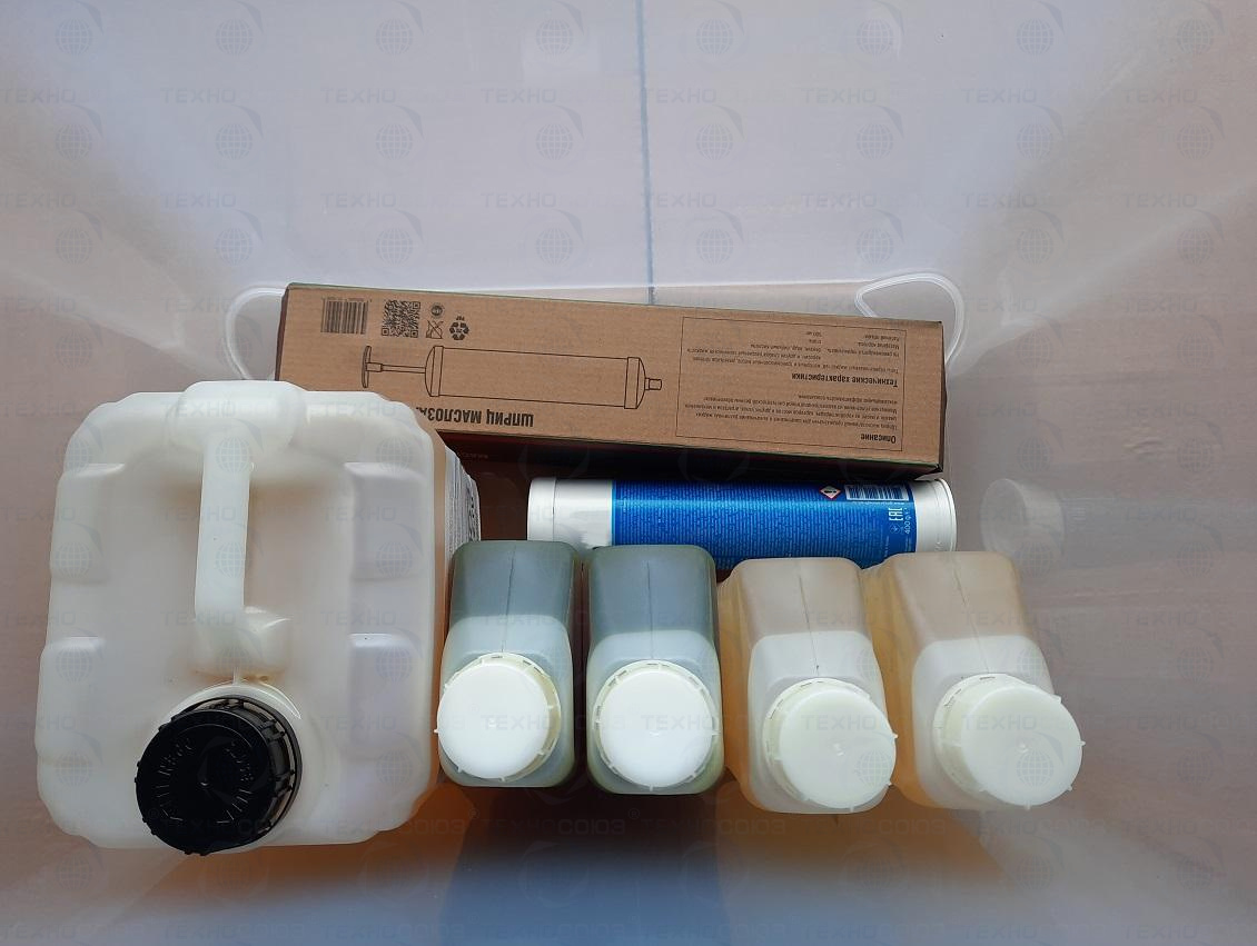 Комплект для ТО грузового шиномонтажного станка включает: Противоизносное бесцинковое гидравлическое масло в гидростанцию. Емкость 7л. + Смазка пластичная для цепи,400гр. С высокими эксплуатационными показателями на основе литиево-кальциевого мыла с содержанием противозадирных присадок (EP-присадок) и твердого наполнителя (дисульфида молибдена). Для смазывания узлов трения в грузовых шиномонтажных станках (направляющие + тавотница) + Масло в редуктор Емкость: 2 л. Трансмиссионное масло для применения в узлах трансмиссии, подверженных высоким нагрузкам (главная передача, ведущие мосты), где требуется уровень эксплуатационных свойств API GL-5. Масла эффективно защищают детали гипоидных передач от износа и задира + шприц для масла пневматический. Объем бака – 0,5л.