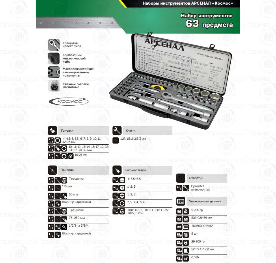 Набор инструментов 63 предмета (М) Арсенал АА-М1412У63 выбор профессионалов для работы дома и обслуживания авто в условиях автосервиса. Хороший подбор головок и бит-вставок. Особо прочная трещотка с металлической рукояткой. Сталь, из которой изготовлен инструмент, легирована хромом и ванадием с нанесением никелевого покрытия. Особо прочный кейс из толстой листовой стали с тройным контуром штамповки. Ламинированные грязе- и маслостойкие ложементы. Наборы инструментов Арсенал имеют пожизненную гарантию. Инструмент Арсенал - Специально разработан для Российских условий!!!