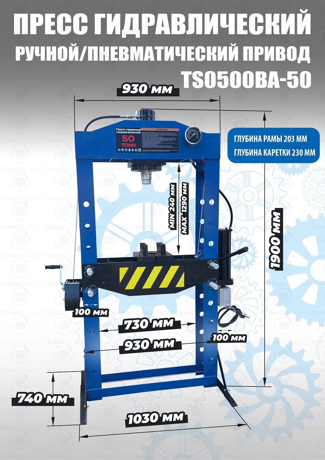 Пресс пневмогидравлический 50 тонн, 264кг. металла, полностью сварная рама, управление ручное/пневматическое, клапан защиты от перегрузки, манометр, ручная лебедка перемещение рабочего цилиндра по ширинеХод поршня 220 мм. Рабочее окно 730х1290 мм. Рекомендуется для выпрессовки подшипников, деталей машин, втулок и т.п. в автосервисе, гараже и СТО. Цвет синий. Доставка РФ, РБ, Армения, Казахстан, Киргизия.
