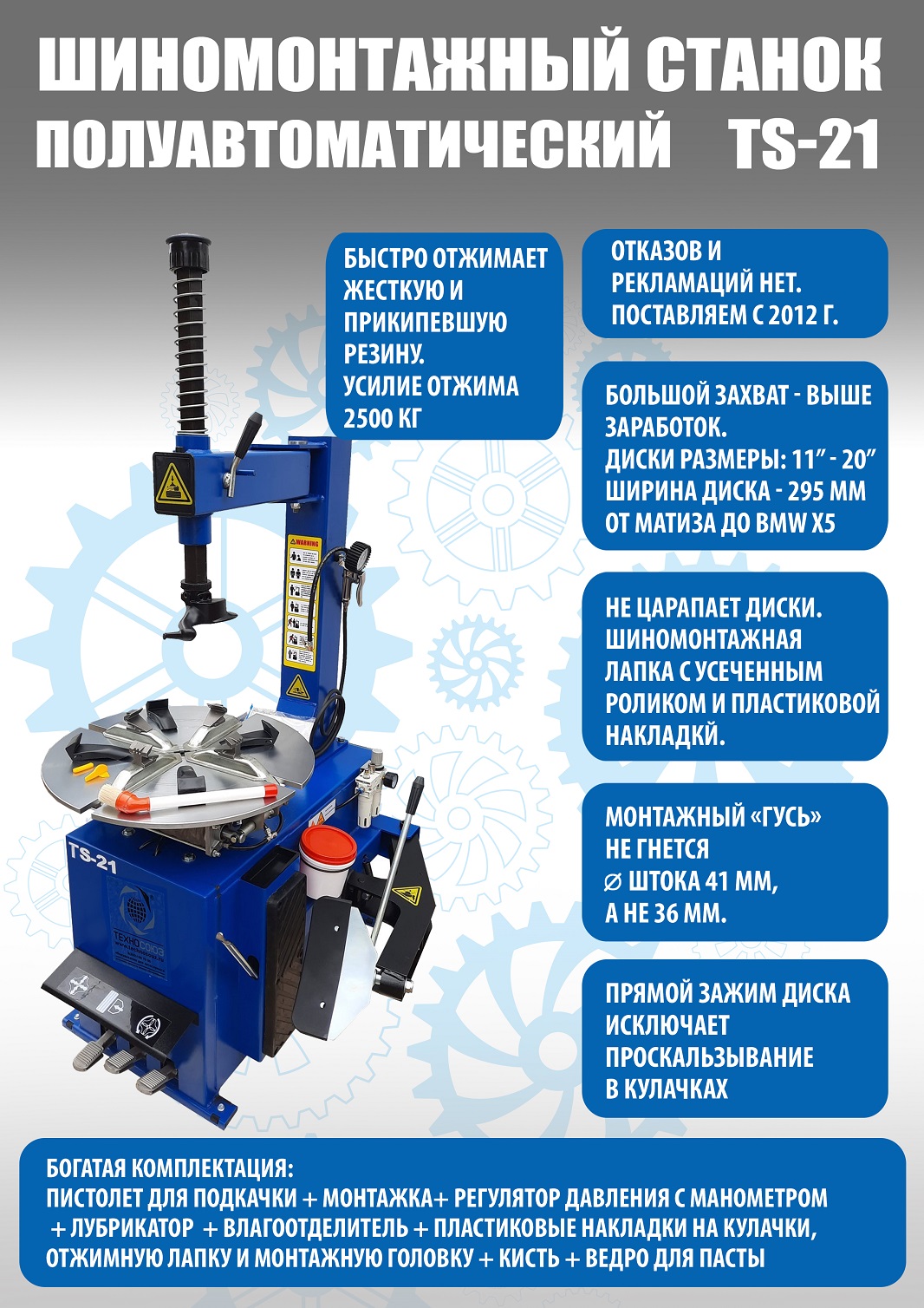 полуавтоматического шиномонтажного стенда TS-21, для колёс 99% автопарка России. От Матиза до Land Cruiser 200, Спринтеров, Газелей и пр. Для дисков: внешний 11÷18”, внутренний 12÷20”. Большой круглый стол Ø 560мм. В комплекте: пистолет для подкачки шин + монтажка + пластиковые накладки на зажимные кулачки + регулятор давления с влагоотделителем и манометром. Может комплектоваться «третьей рукой» для работы с низким профилем (опция). Очень надёжный шиномонтажный станок, рекомендуем. Напряжение шиномонтажных станков 220В или 380В на выбор.