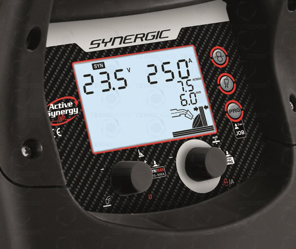 Синергетическая регулировка параметров сварки, благодаря технологии ONE TOUCH LCD SYNERGY, делает аппарат чрезвычайно простым в использовании. Данная модель имеет 40 заранее заданных синергетических кривых, предусмотренных для конкретных задач и материалов.