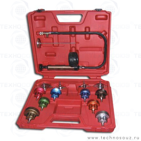 Тестер для проверки герметичности системы охлаждения. Укомплектован высокоточным манометром, диаметром 63 мм, комплектом из 12 адаптеров и термометром. Адаптеры, входящие в комплект позволяют подключаться к различным системам охлаждения двигателей внутреннего сгорания.