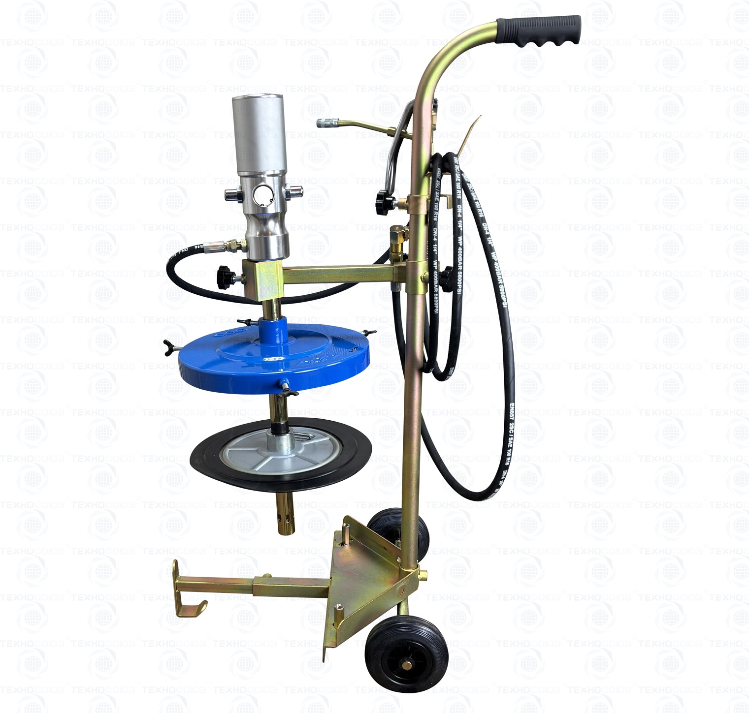 Нагнетатель смазки на ведро 18-20 кг. Пневмонасос 50:1 + тележка на 2 колесах с ручкой + армированный шланг длиной 4 м + крышка Ø 310 мм + мембрана + пистолет с наконечником для тавотниц оборудован "Z" образным шарниром для удобной и беспрепятственной работы в трудно доступных местах (вращение на 360град.). Подходит для ведер с внутренним Ø 260-300 мм. Давление смазки 350-400 Атм. Производительность 800 г/мин. Вес: 16 кг.
