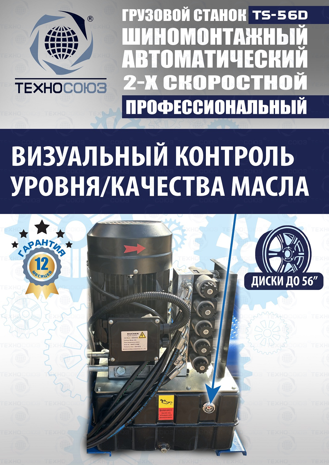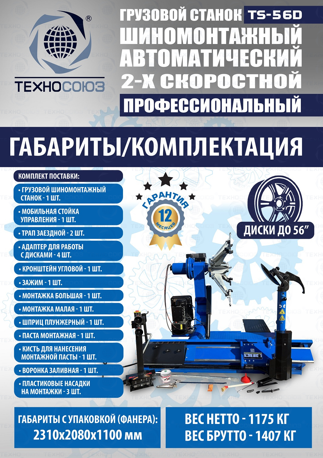 Двухскоростной грузовой шиномонтажный станок автоматический предназначен для шиномонтажных работ с колёсами автобусов, тракторов, строительной техники с диском 14-56”. Максимальный диаметр колеса 2500 мм, позволяет делать колеса "спарку" с шириной диска до 1200 мм. Максимальный вес до 2000кг. У данной модели: привод 4000 Вт, мотор гидронасоса 4000 Вт - может работать с жесткой резиной!!! Отжим min-max. 1 скорость - 4900-11302Н/м. 2 скорость - 3300-9300Н/м.