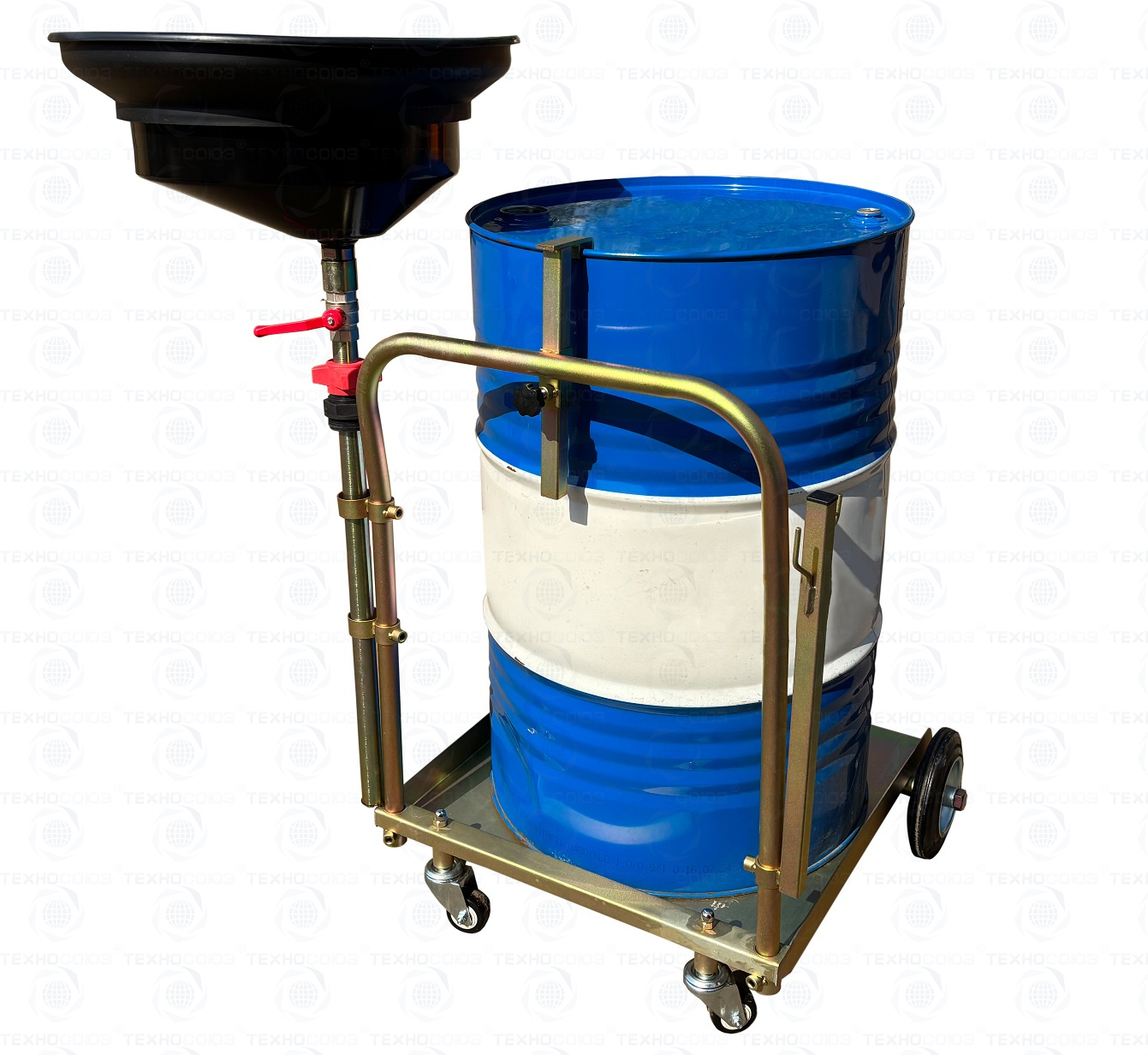 Установка для слива/сбора «отработки», антифриза в бочки 60÷220л. на подкатной анодированной тележке. Для любых транспортных средств, вывешенных на подъёмнике. Высота регулируется зажимом 1450÷2050мм. Фиксатор бочки на тележке. Сетка для улавливания мелких деталей, фильтров и предотвращения разбрызгивания. Поворотная воронка 360⁰ со смещённым сливным отверстием. Шаровой кран для контроля слива. Обрезиненные колёса большого диаметра для не ровных полов. Контроль заполняемости бочки через отверстие для воздуха.
