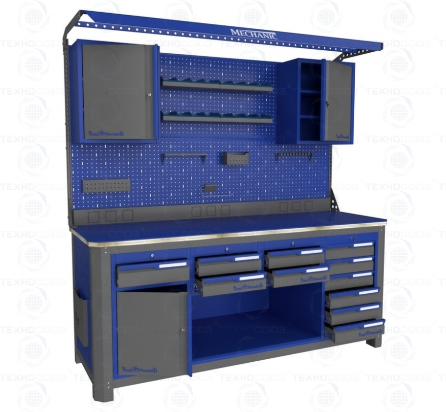 В состав рабочего места входит: Рама (металл 1,5 мм.), столешница (фанера 24 мм. + металл 6 мм.), 2 боковые перфорированные панели, модуль с дверцей и ящиком, модуль подвесной, полка-стенка, модуль с 6-ю выдвижными ящиками, блок розеток, комплект усиленных кронштейнов, 2 экрана, козырек с лампой освещения, навесной шкафчик, 4 полочки, 16 пластиковых контейнера, держатель универсальный, держатель для баллонов, держатель для ключей, держатель для отверток, держатель для бумажных полотенцев, кармашек.