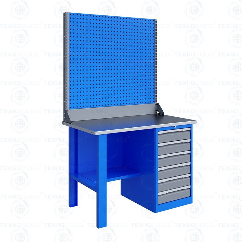 Однотумбовый. Допустимая нагрузка на столешницу 750 кг. Опорные элементы выполнены сварными из холоднокатаной стали. Для выполнения сборочных, ремонтных, слесарных, монтажных и других видов работ на производстве, в сервисных центрах, мастерских, гаражах, а также для обучения технологии в учебных заведениях. Комплектуется полкой-стенкой, расположенной под столешницей для удобного размещения габаритного инструмента и оснастки. Размеры верстака: 855x1196x696 мм. Вес: 78 кг. Поставляется в 4 комплектациях на выбор.